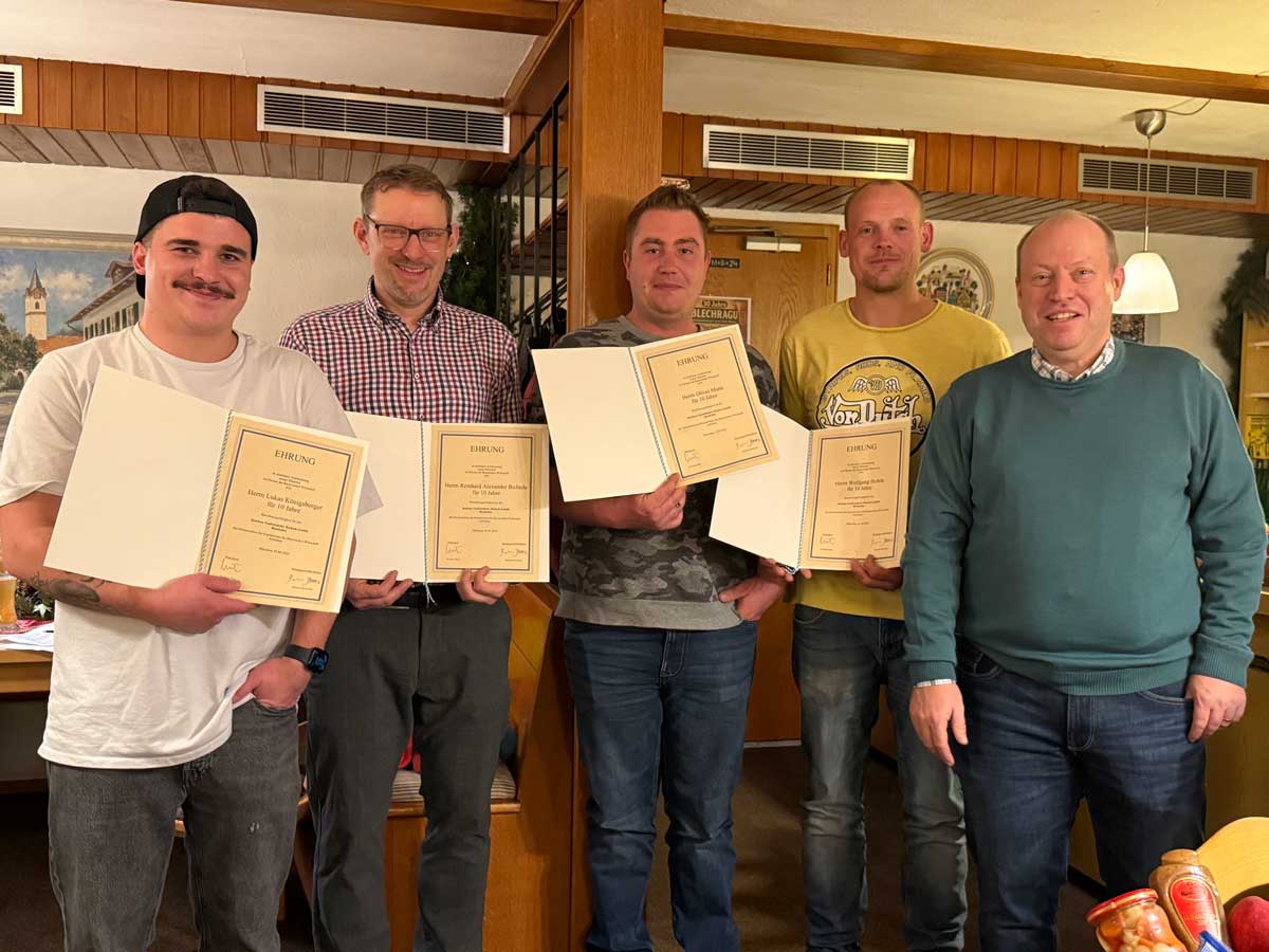 Blonhofen – Im Rahmen der diesjährigen Weihnachtsfeier der Taufratshofer Bichtele GmbH wurden vier Mitarbeiter für ihre zehnjährige Betriebszugehörigkeit geehrt. Eine Auszeichnung, die in Zeiten stetigen Wandels besondere Bedeutung hat. Geehrt wurden Wolfgang Hefele, Lukas Königsberger, Oliver Mann sowie Reinhard A. Bichtele,